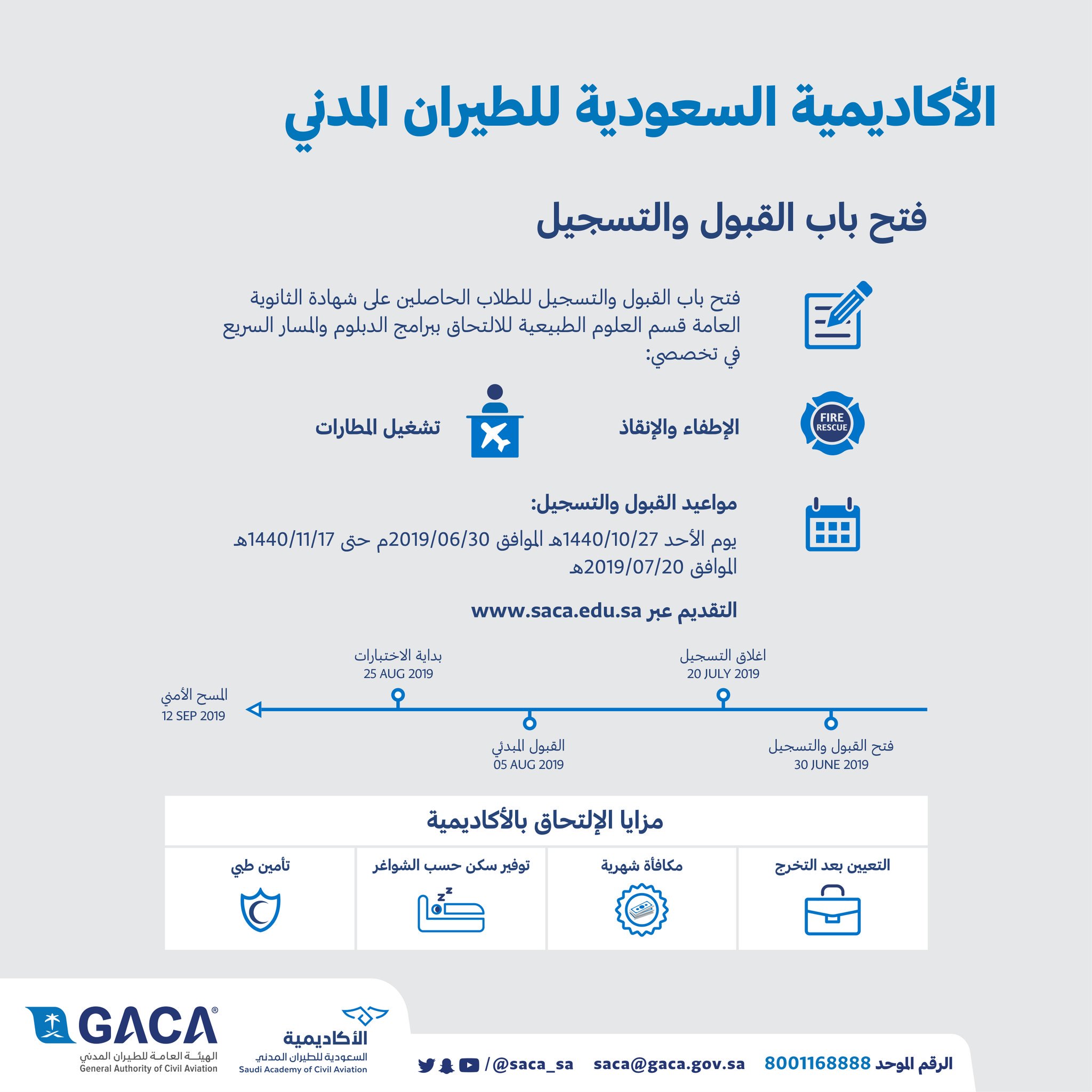 الرياض 27 شوال 1440 هـ الموافق 30 يونيو 2019 م واس أعلنت الأكاديمية السعودية للطيران المدني التابعة للهيئة العامة للطيران المدني فتح باب القبول والتسجيل للطلاب الحاصلين على شهادة الثانوية العامة قسم العلوم الطبيعية. كل الحقوق محفوظة للهيئة العامة للطيران. وفقا للبروتوكولات الصحية المحددة. الطيران المدني يجهز مطار المؤسس لاستقبال أولى رحلات العمرة غدا.