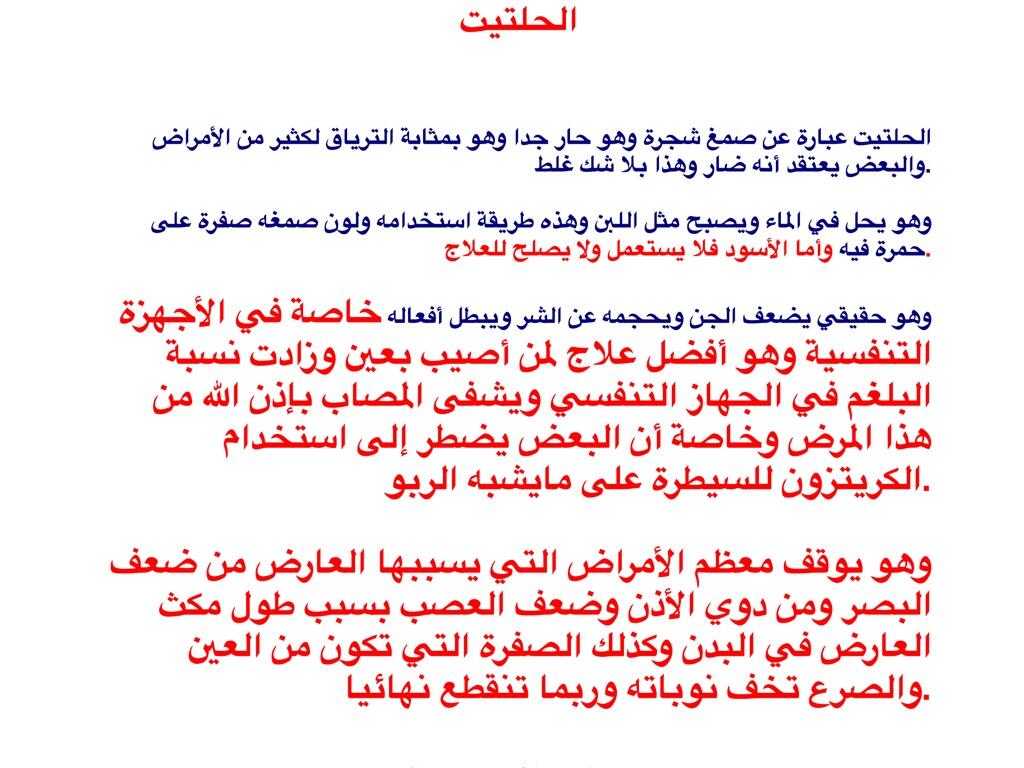 الحلتيت في علاج السحر. من اعظم فوائد الحلتيت انه يفيد فى علاج المس حيث ان الجن ينفر من رائحته جدا وهو فى ذلك يعتبر من اقوى الروائح والاعشاب اقوى حتى من المسك الاحمر فى طرد المس. طريقة استخدام الحلتيت لفك السحر يتم استخدام الحلتيت أيضا في علاج السحر وخاصة سحر المأكولات والمشروبات. حسن المدني 39 256 views 10 04. يعد الحلتيت من الأعشاب الطبيعية التي شاع استخدامها لفك السحر إذ أنه يفيد في علاج نوعين من أنواع السحر وهما السحر المأكول أو المشروب ومن أبرز وصفات استخدام الحلتيت في فك السحر الوصفة الآتية.