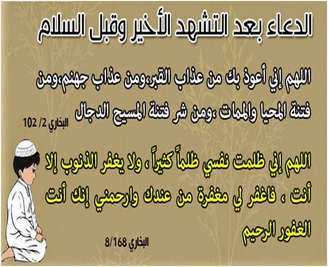 الدعاء في التشهد الأخير 5236 تاريخ النشر. التحيات في الجلوس الأول بعد الثانية وفي الثالثة في المغرب وفي الرابعة في الظهر والعصر والعشاء ثم تقول بعدها في التشهد الأخير في الثالثة من المغرب والرابعة من الظهر والعصر والعشاء وفي صلاة الفجر والجمعة والعيدين. 24 الدعاء بعد التشهد الأخير وقبل السلام. رقم790 وهذا الد عاء ي مكن أن يجعله المصلي في التشهد الأخير بعد الاستعاذات السابقة.